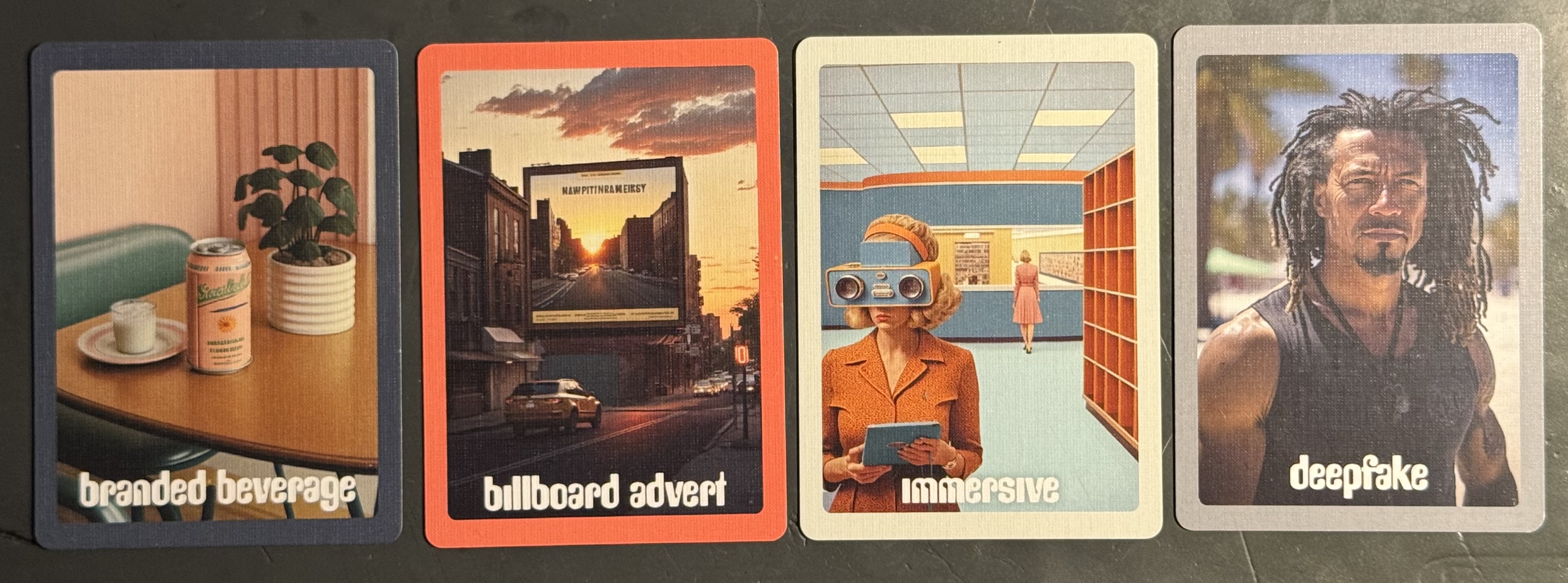 As an object, the cards dictated a branded beverage, combined with a billboard advert as archetype, immersive as attributes, and a deepfake as action.